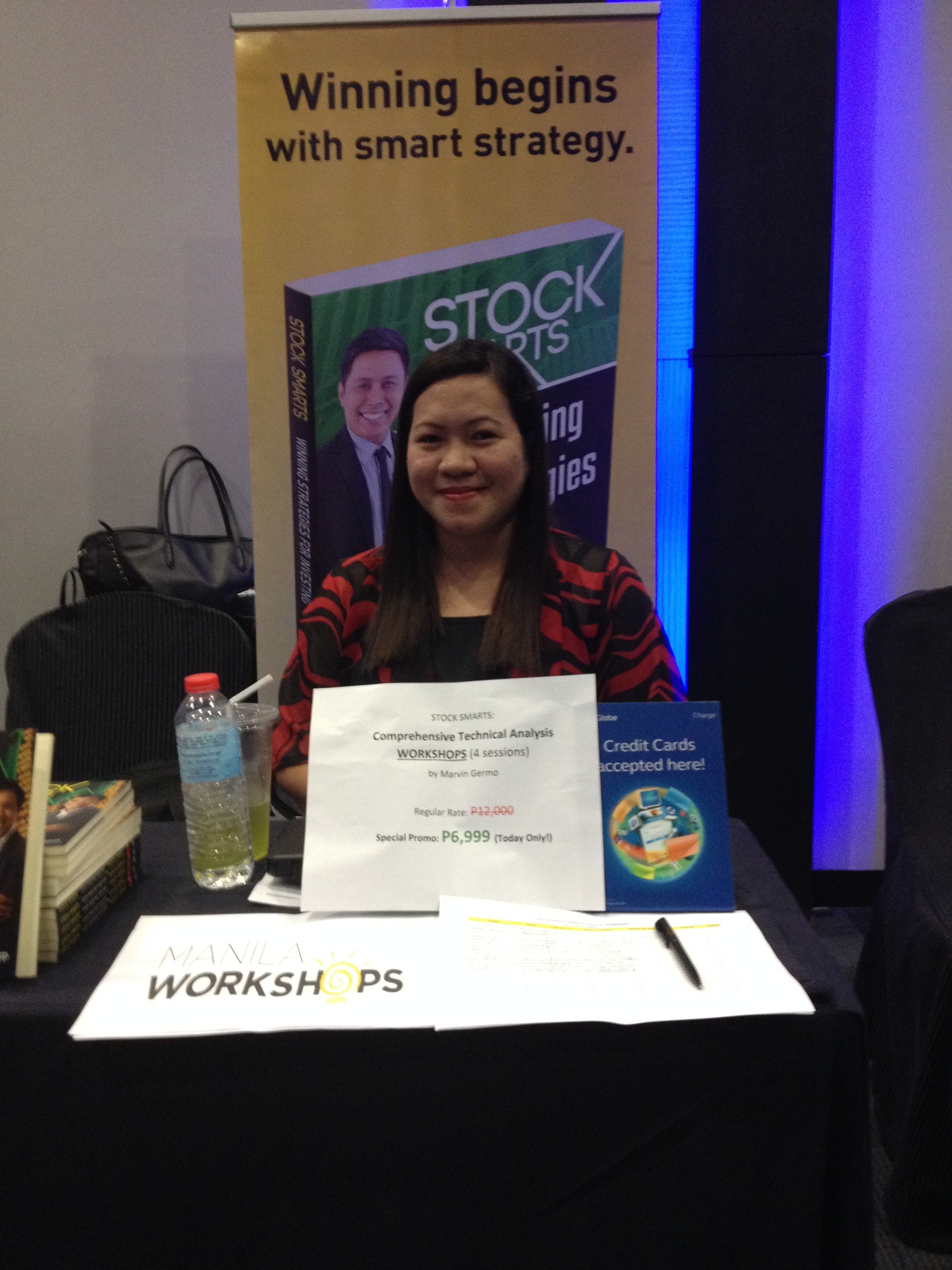 I went there to co-promote the upcoming workshops of Marvin in partnership with Manila Workshops, which is the Comprehensive Technical Analysis Series to be held in June-July of this year. It was also the book launch of Marvin’s third book, entitled, Stock Smarts Stress-free Investing, which was a big hit at the event. And thanks also to Mrs. Stock Smarts, Yvonne Goh-Germo, for giving me a copy of this book. 🙂